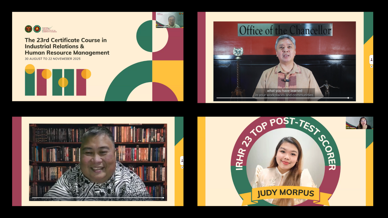 IRHR 23 earned an impressive 4.72 average rating (on a 5-point scale) for overall course quality. Participants highlighted rich real-world examples and highly relevant IR topics, deepened understanding of HR and IR concepts, insightful sharing of organizational practices across industries, competent, humble, and engaging speakers and faculty, appreciation for the capstone presentations and expert critiques, timely, structured, and well-organized sessions, and high regard for Dr. Binghay’s structured and disciplined teaching approach, which helped maintain focus in an online setup.